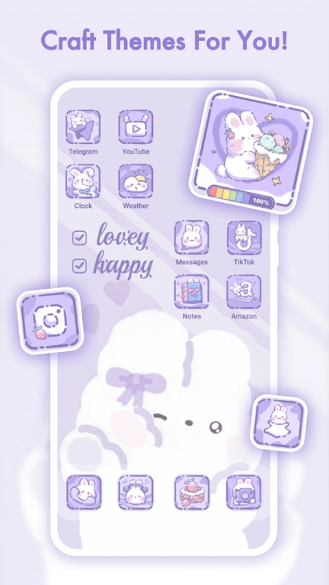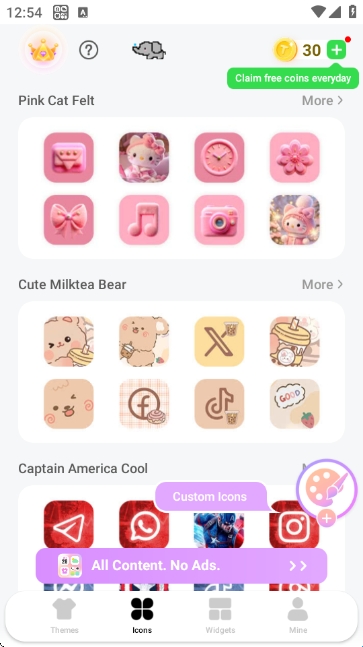 进入“Icons”板块,可选择不同风格的图标包(如Pink Cat Felt、Cute Milktea Bear等),也可点击“Custom Icons”自定义图标。