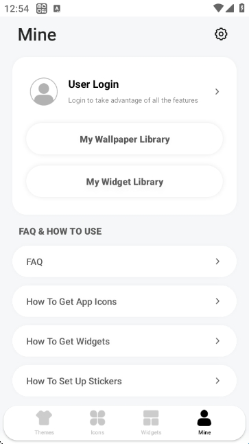在“Mine”板块可登录账号,查看我的壁纸库、小部件库,还可查看FAQ及使用教程(如如何获取应用图标、小部件等)。