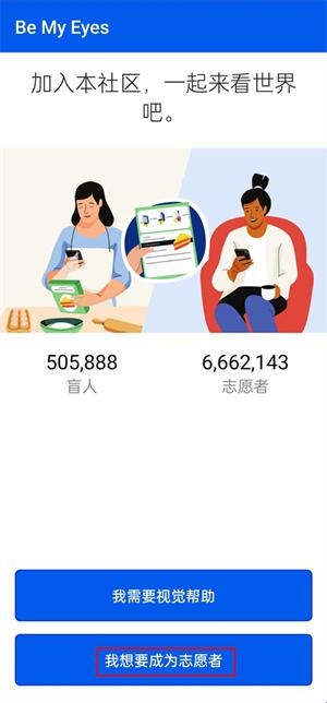1、下载安装be my eyes,如果你是想成为志愿者的话,点击下方的我想成为志愿者;