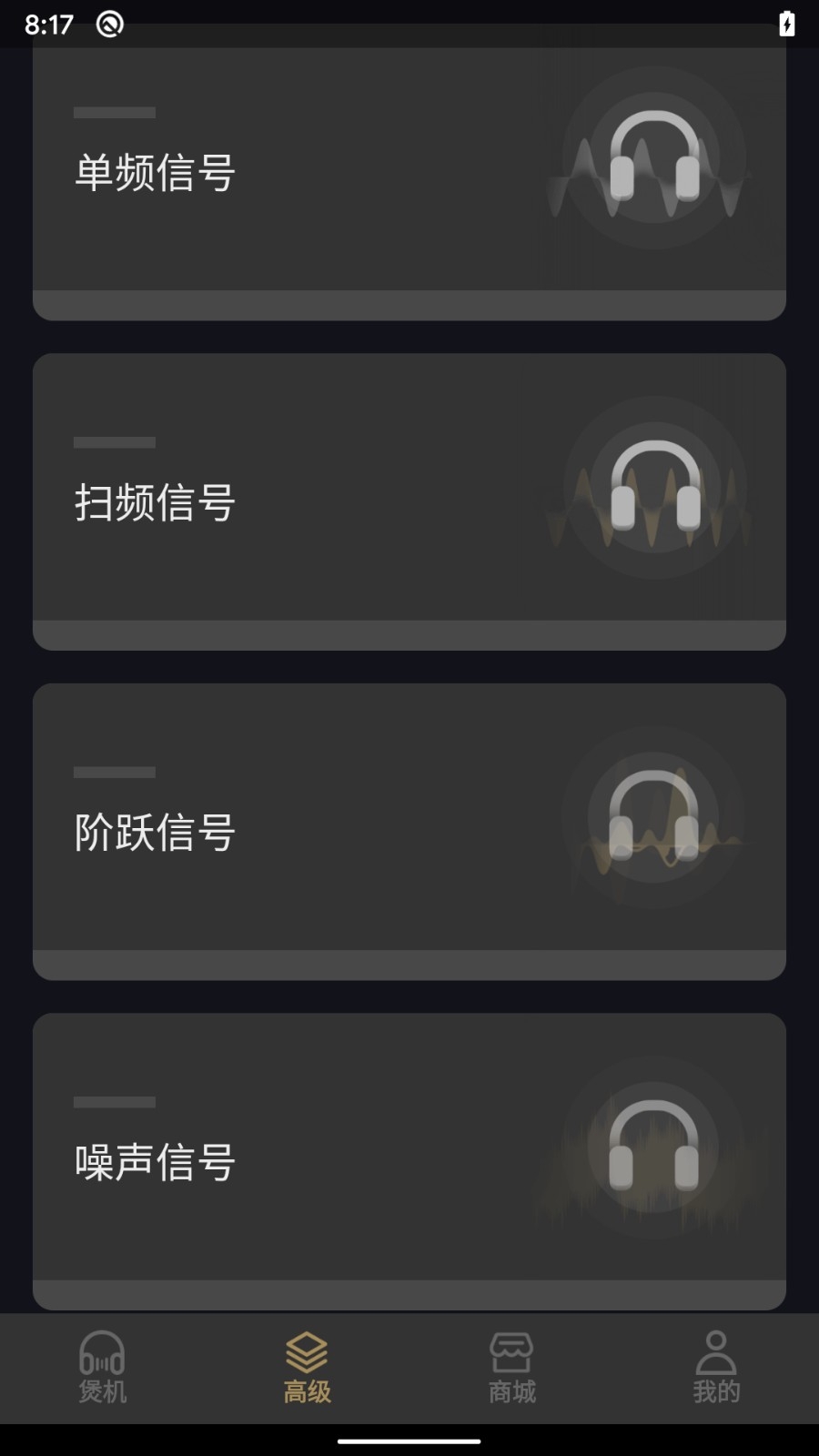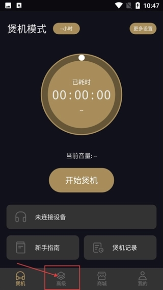 1、打开煲机助手App,在【煲机】页面点击底部的【高级】选项,可进入高级功能界面,这里提供了多种信号模式供选择,是自定义煲机参数的入口