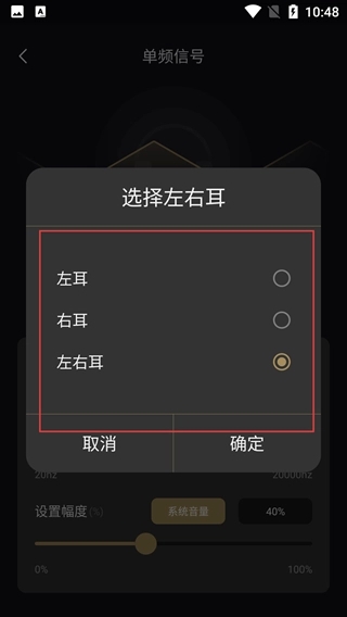 4、点击【选择左右耳】选项,可打开选择弹窗,在其中选择【左耳】【右耳】或【左右耳】,确定后即可指定信号的播放声道