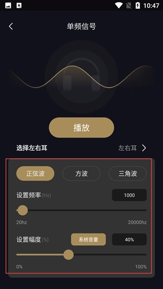 3、在【单频信号】页面,可选择波形类型(如【正弦波】)、调整频率和幅度,设置完成后点击【播放】即可启动该信号
