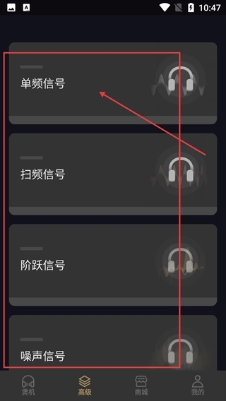 2、进入【高级】界面后,可看到【单频信号】【扫频信号】等多种信号类型选项,选择对应选项即可进入该信号的详细设置页面