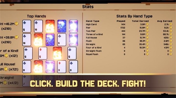 1、本作的核心玩法巧妙地融合了扑克牌组构筑与点击放置增量游戏的元素。