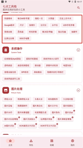七点工具箱提供了与生活日常、系统操作、图片处理、搜索查询、资源提取、文字操作、以及其它工具相关的近100个工具,基本满足您在日常使用手机时的所有工具需求。