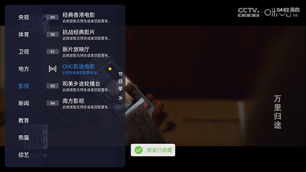 4、长按想要收藏的电视频道名字即可添加至收藏。