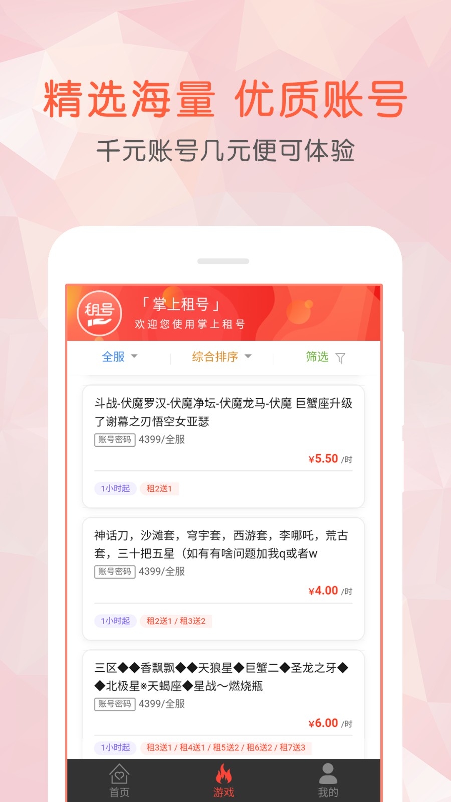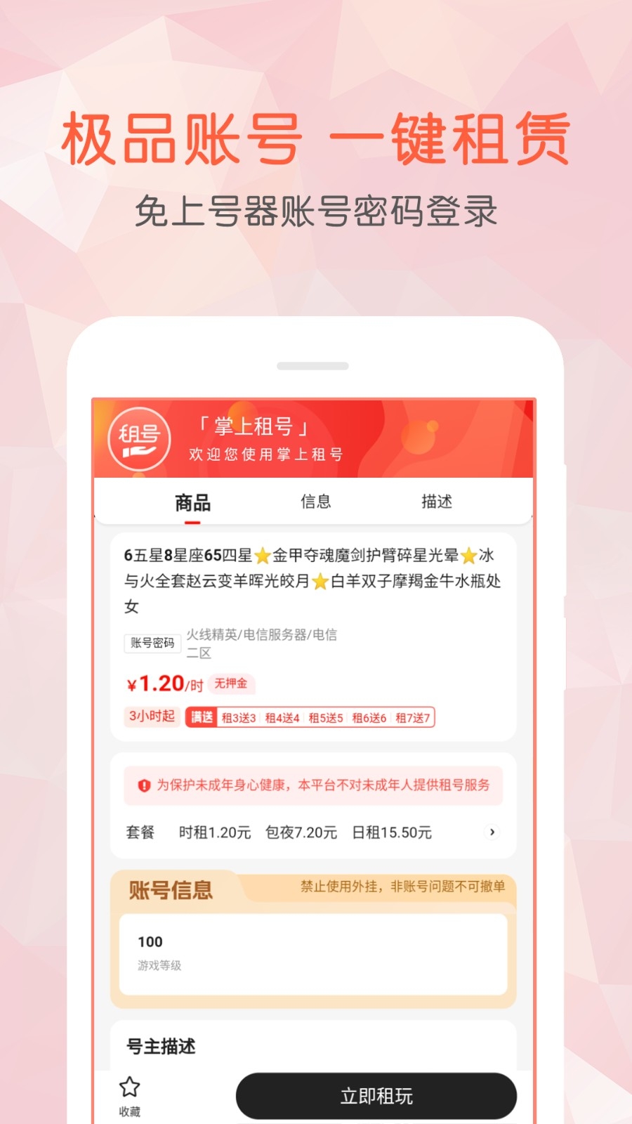 1、以极低价格即可租赁千元级优质账号,让用户以低成本享受顶级账号的皮肤、段位及装备,满足娱乐需求。