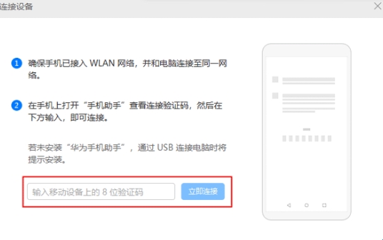 3、将手机上显示的八位验证码输入至电脑端的验证码输入框中即可连接。