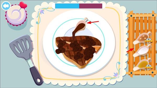 7、牛排淋上酱汁后,玩家根据客人的需求选择右侧的配餐添加到餐盘里;