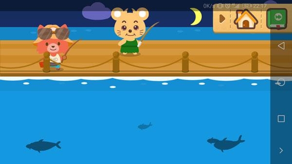 6、当你觉得无聊的时候,你可以点击下方的鱼的标志,跟着你的邻居一起去钓鱼,钓鱼的方法很简单,点一下河面是抛竿,然后等到有鱼上钩了之后就再点一下屏幕,鱼就可以上钩了,每次都会调到不同的鱼,运气好的时候还会调到一些珍稀物种哦。