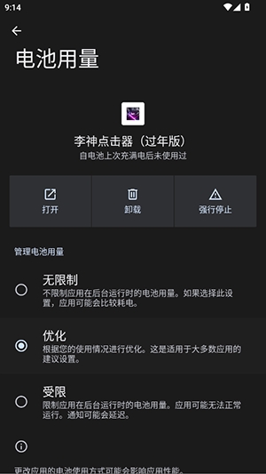 2、无限制功耗:将其设为“省电策略-无限制”,确保在锁屏或长时间运行时点击不中断。