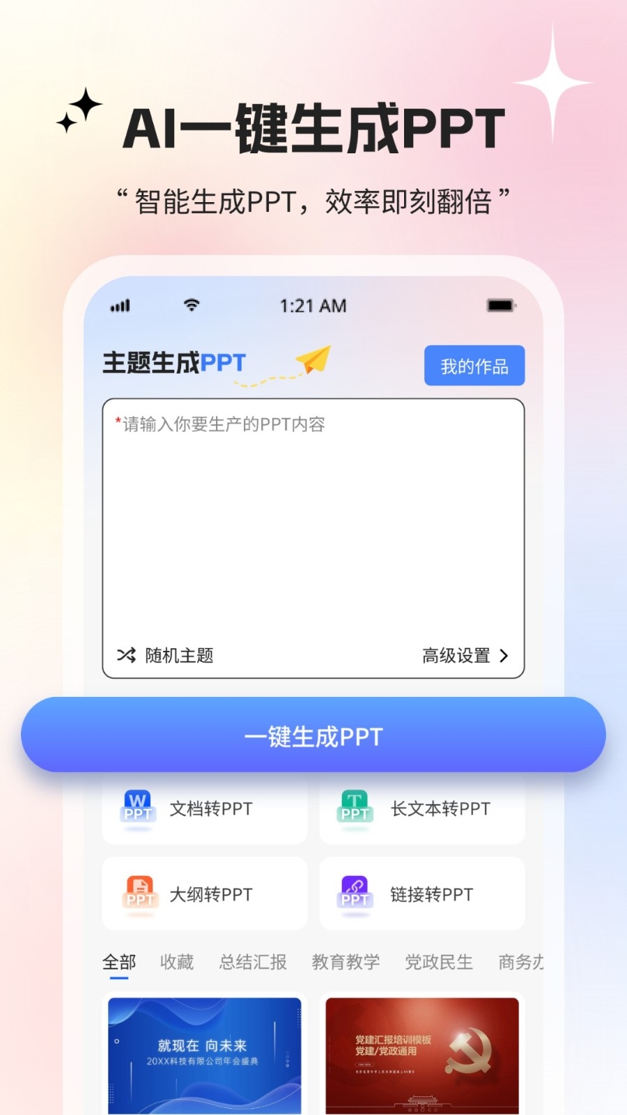 2、职场办公人群:可快速制作PPT、工作总结、汇报材料、发言稿。