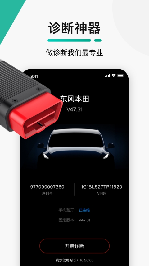 通过蓝牙与诊断接头进行连接,读取车辆数据。覆盖车型多样,包括中国车、美洲车、欧洲车、亚洲车;覆盖功能完整,EOBD、ABS排气、保养灯归零、节气门匹配等;