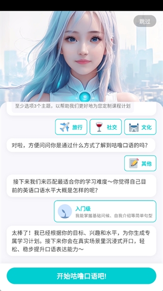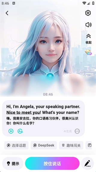 2、通过与AI角色Angela进行口语交流,模拟真人对话学习口语技巧。