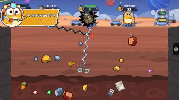 5、矿洞深处分布着带电矿钩和电箱,若误勾会触发闪电并造成大量收益损失,当出现蓝色警示图标时,应及时调整钩子角度,避开危险区域。