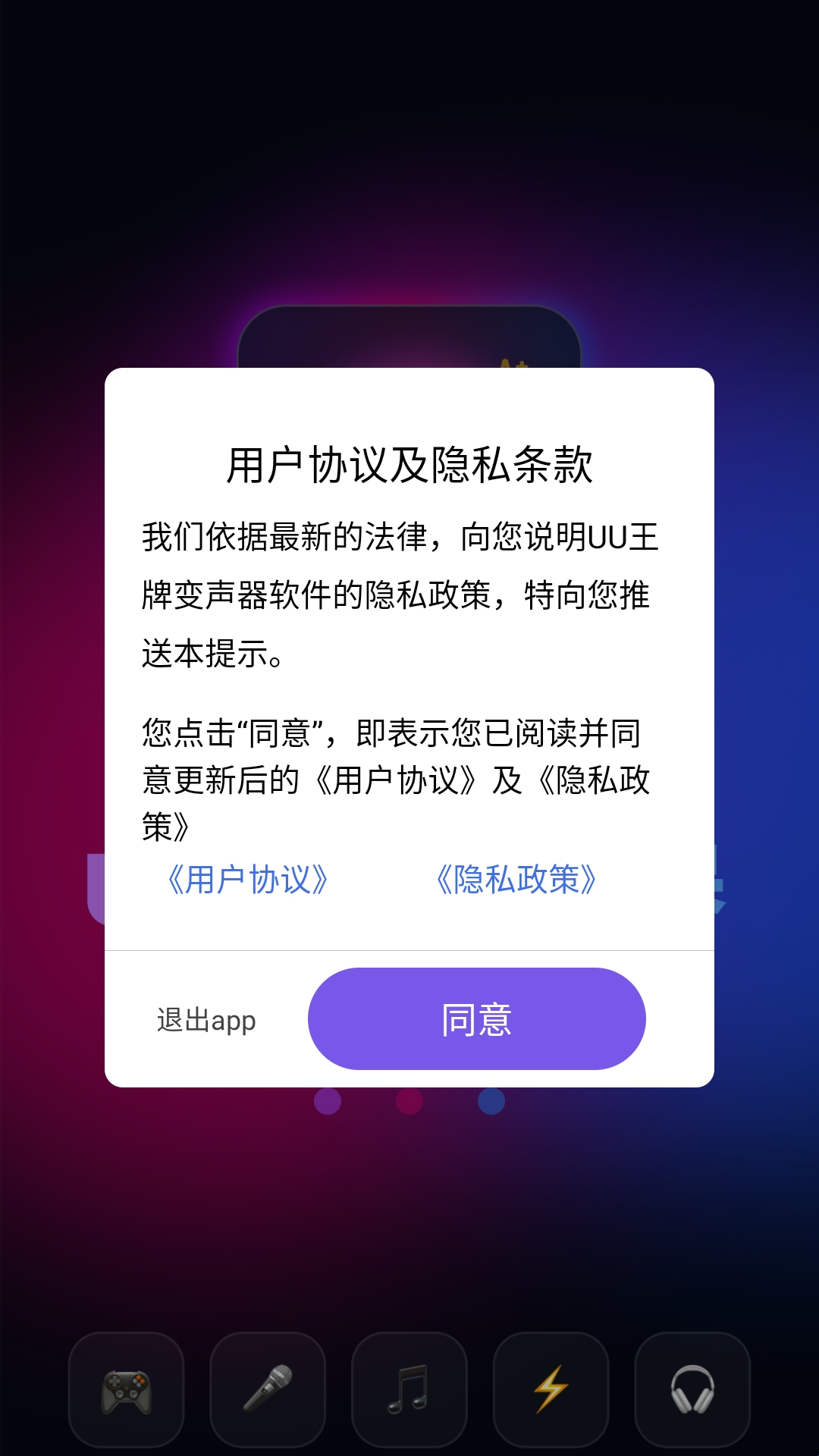 1、在本站下载安装并打开UU王牌变声器,点击同意进入软件,