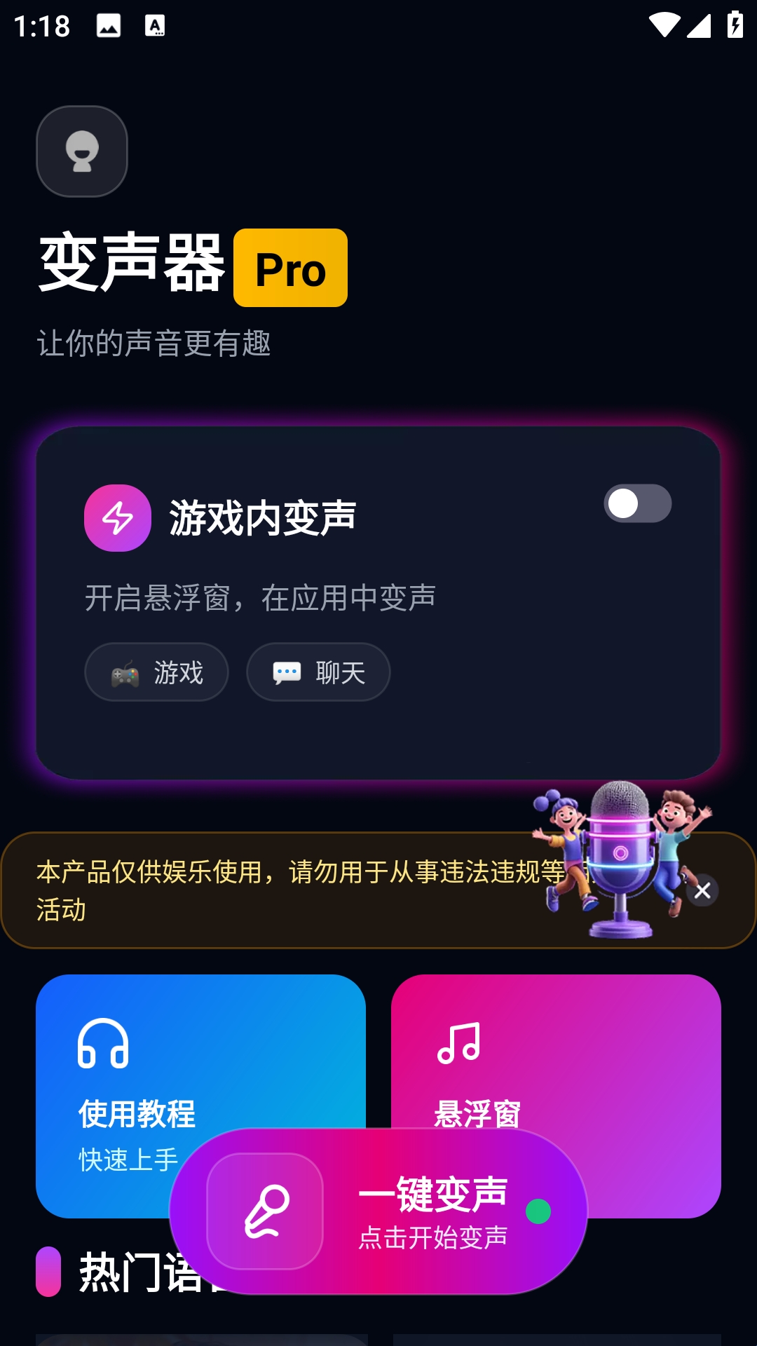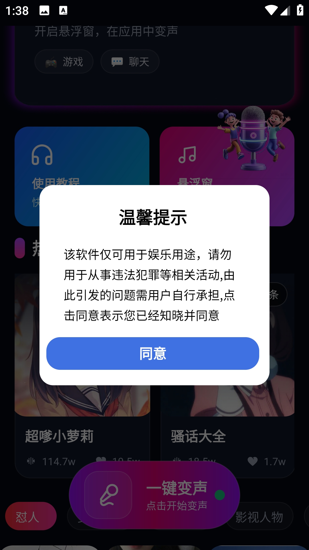 4、点击一键变声,同意后即可开启。