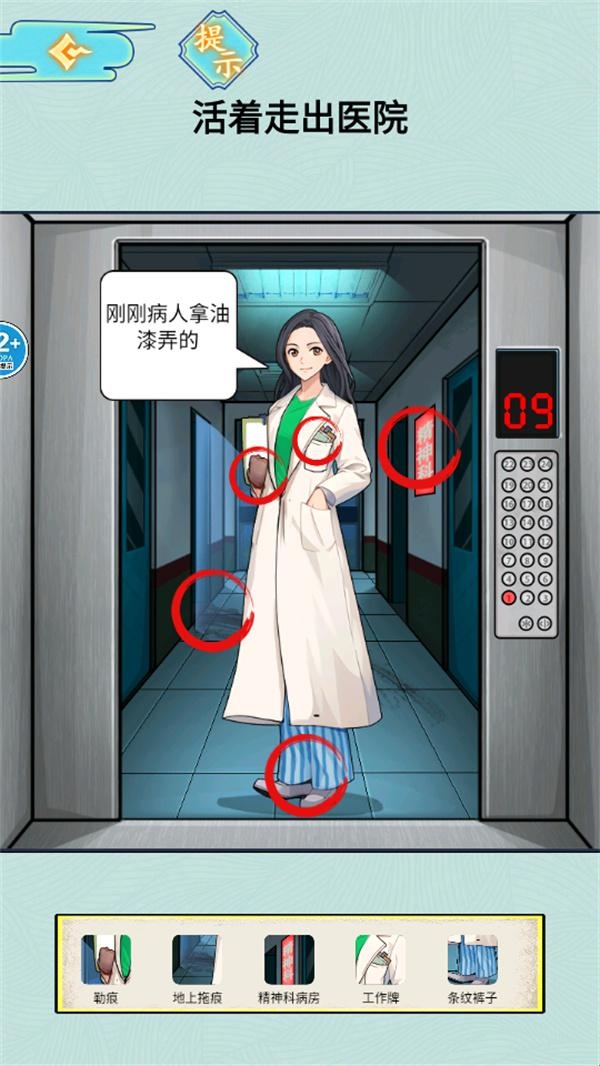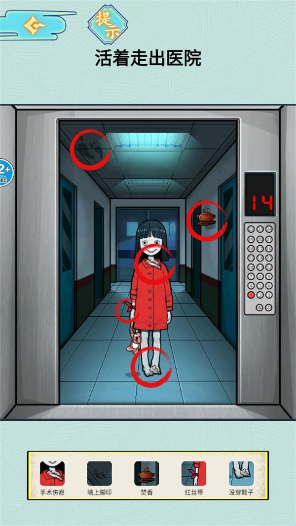 1、点击天花板上的脚印,女孩的脚,女孩手里红丝带,女孩脖子的疤痕,病房旁的焚香。