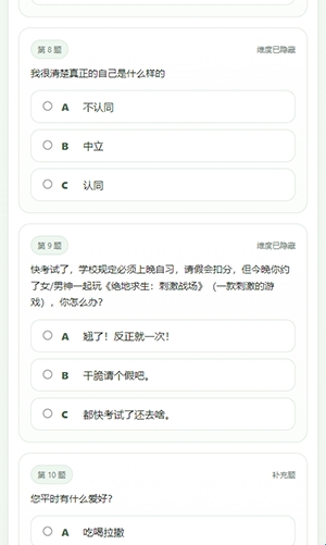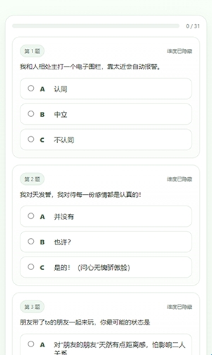 应用界面设计了明显的测试进度条,使用户对答题进程一目了然。无论你是在碎片时间完成测试,还是连续作答,都能清楚掌握当前进度,降低中途放弃的可能性。这种设计有效优化了使用体验,适合忙碌但又希望了解自己的人群。