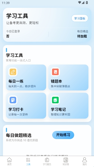 5、切换至“工具”页面,使用“每日一练”“错题本”“学习打卡”“学习笔记”等辅助功能提升效率。