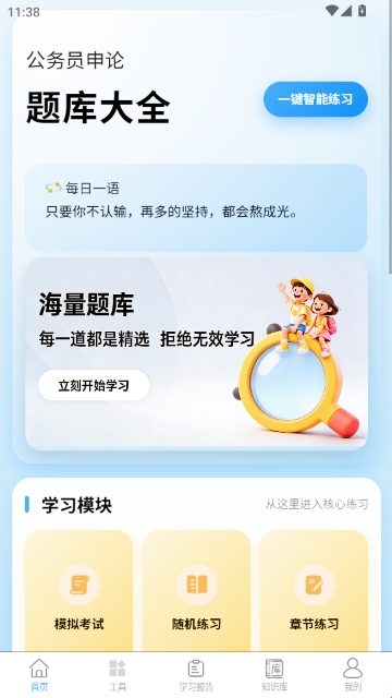 2、进入首页后浏览“每日一语”与“海量题库”,点击“立刻开始学习”或“一键智能练习”。
