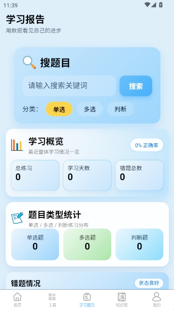 6、进入“学习报告”查看学习概览,包括总练习数、学习天数、错题总数及各题型分布统计。
