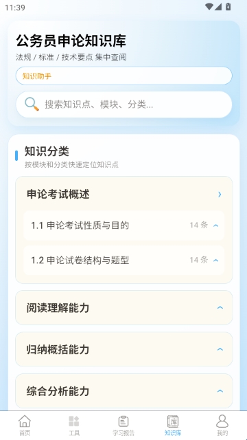 7、点击“知识库”查阅申论考试概述、阅读理解能力等知识点,支持按模块和分类快速定位内容。