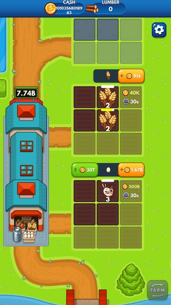 空闲农场大亨是一款模拟经营农场的游戏,在游戏中玩家将会拥有一个属于自己的农场,玩家需要自己悉心经营这个农场,可以自己选择种植粮食作物与畜牧业的比例,收集到的农产品可以送去加工,制作成第二产品出售出去,赚取金钱。