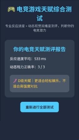 你平时有玩游戏吗?你感觉自己的实力如何呢?如果感觉自己有天赋的话,可以来电竞游戏天赋测试中进行测试一下哦。软件中有多种测试方式可以选择,选择好对应的测试方式后就可以开始了,测试完毕后软件会给出相应的结果,并且对你进行指导,什么地方需要改进等,都可以轻松知晓。