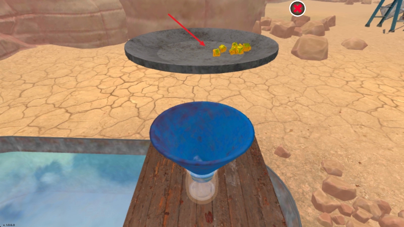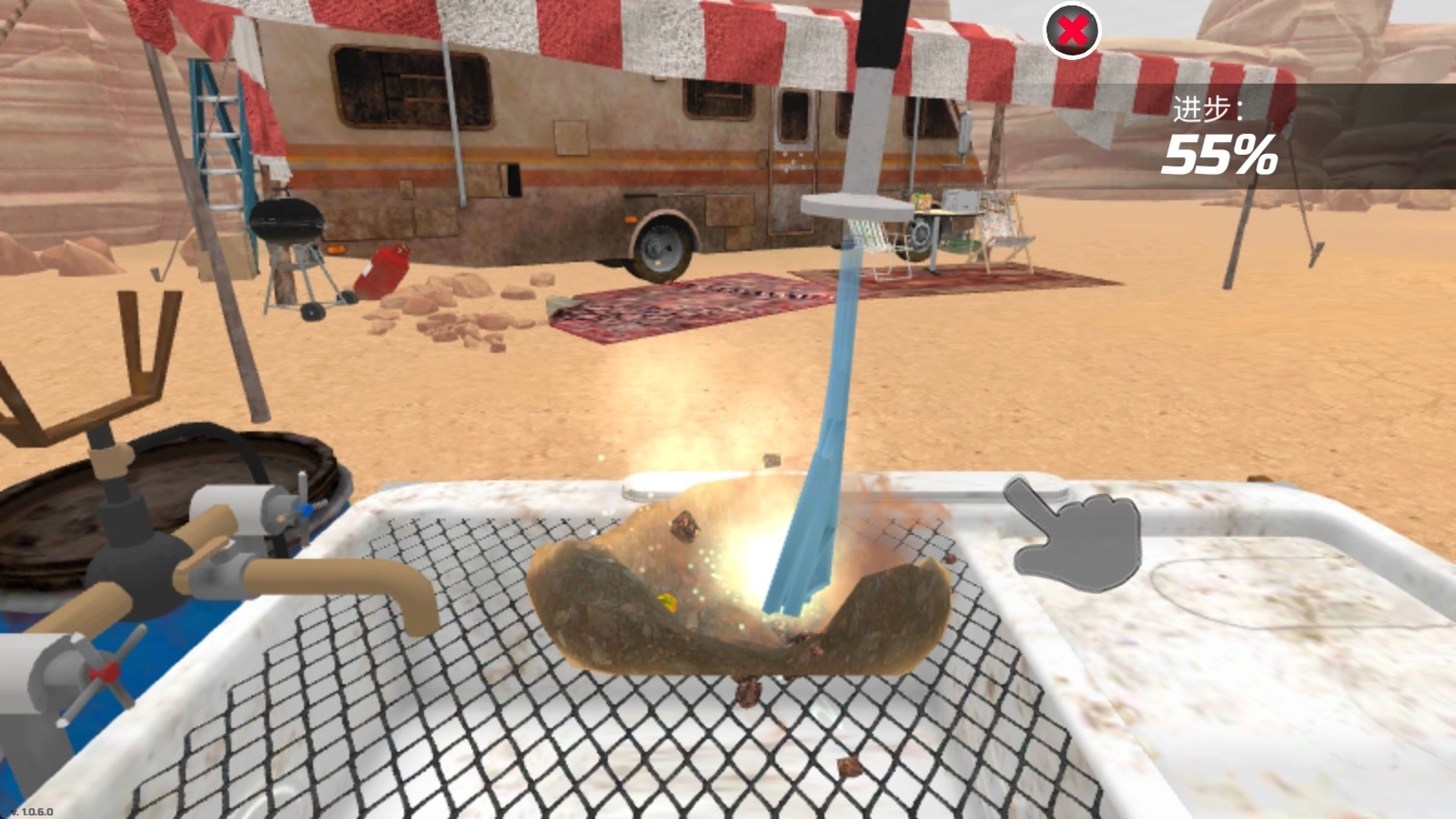 2、接着拿出铲子开始挖掘,等矿石的完整轮廓显露出来后,我们就能用桶把它装起来了。