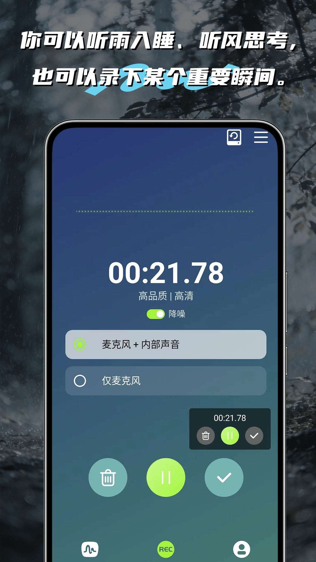 1、内置20多种真实录制的自然白噪音源,每一个都经过降噪处理。