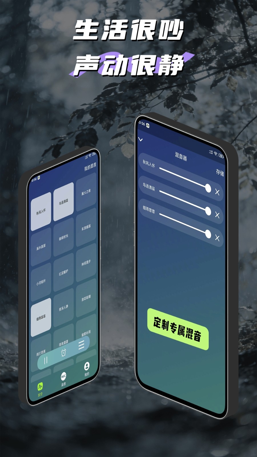 内置近两百种高保真白噪音,涵盖雨声、海浪、森林虫鸣等多种类型,支持自由组合多种音效,调节音量比例,打造专属助眠声景。