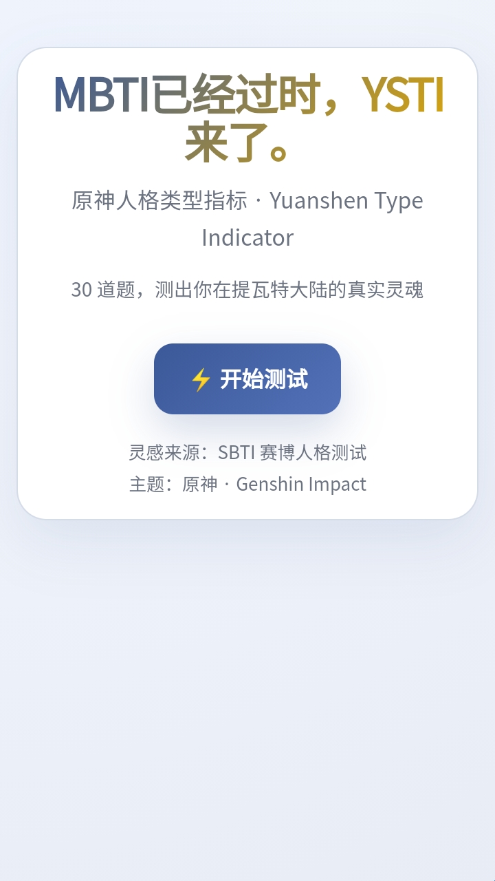 SBTI人格测试最近在网络上爆火一时,随之推出的便是SBTI原神人格测试。你想知道如果自己去到原神的世界中,自己会成为什么样的人吗?那就来SBTI原神人格测试中测试一下吧。这里面有着30道题目可以完成,完成后就会根据你的每个选项来与其他角色进行匹配,并生成你最符合的人设哦。