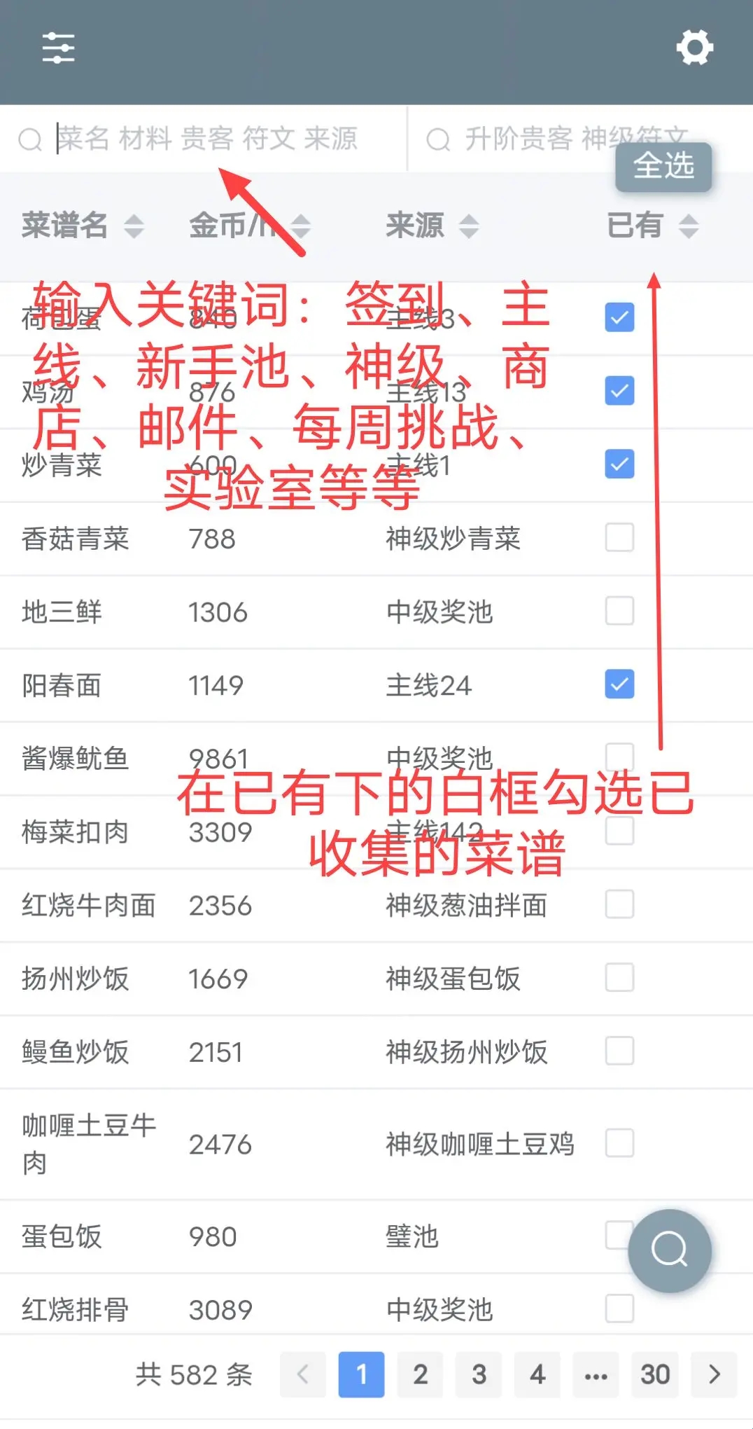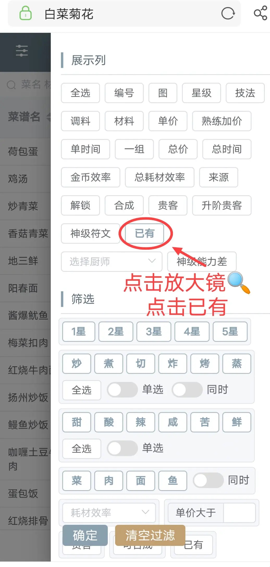 2、点击放大镜后,在已有选项中勾选自己已经收集的菜谱内容。