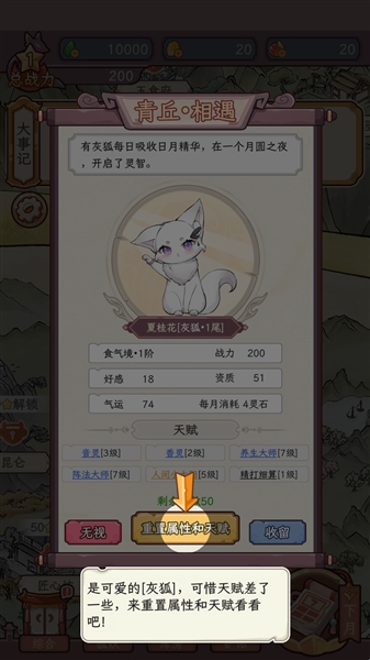 5、可以对相遇的小狐狸进行天赋和属性的重置,如果对属性和天赋满意了就可以点击收留;