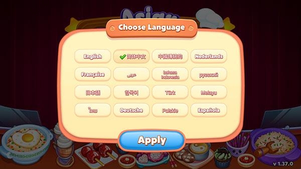 1、进入游戏之后,我们第一步是需要先选择游戏语言,这里选择完简体中文之后,点击Apply即可。