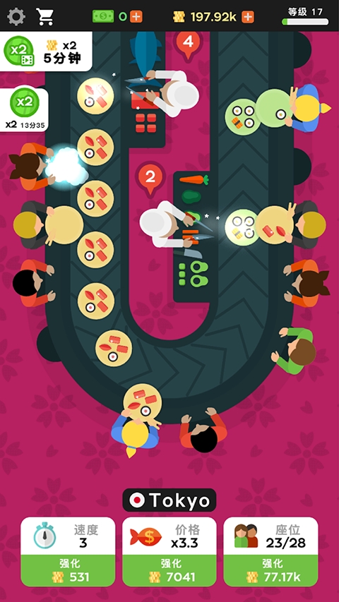放置寿司店是一款节奏非常快的经营模拟游戏,玩家在游戏中拥有一家属于自己的寿司店,作为寿司店的店长,店内食材原料的采购以及菜品的上新,全靠玩家自己去选择,面对众多前来光顾的客人,玩家必须要提高寿司店的效率。