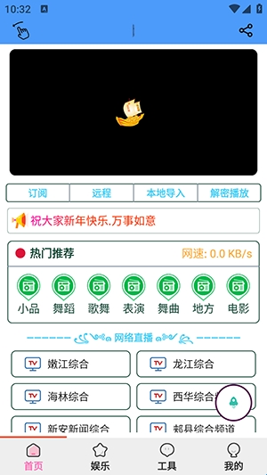 2、点击娱乐板块,这里提供了多个电视频道分类可以选择。