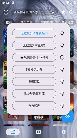 1、软件自带影视源接口配置,点击左上角的小方块可以切换。