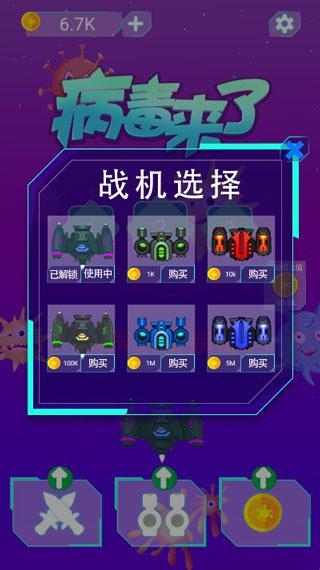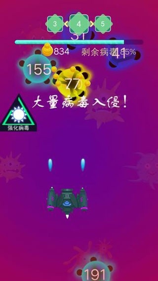 病毒来了是一款非常搞怪解压的飞机射击游戏,在游戏中玩家的主要任务是操纵武器来攻击前方的病毒,把这些病毒的血条给打空,玩家就能够获得这款病毒的血清与疫苗,玩家每消灭一个病毒都会获得金币奖励,这些金币可以用于升级自身的武器。