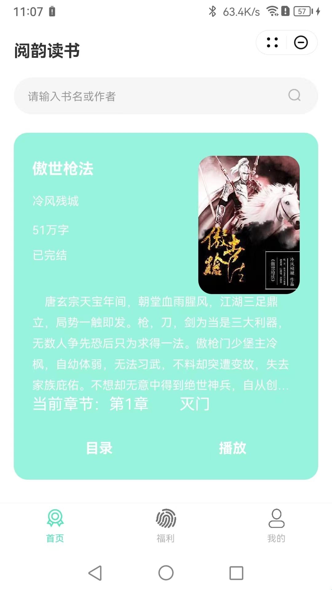在阅韵读书里,内置了大量的小说资源,用户可以在搜索中查找自己想要阅读的小说,也可以首页中看看有哪些推荐的小说,可以将其加入到书架中进行阅读哦;阅读还可以获取一些福利,阅读的时长越长也领取的奖励也就越多,可以在软件中的福利板块中详细查看。