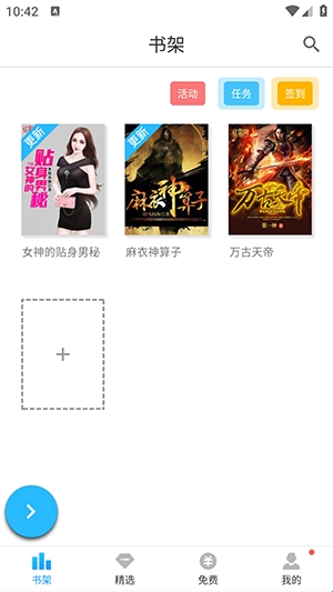 任务、福利袋、签到、商城、历史、书友圈。