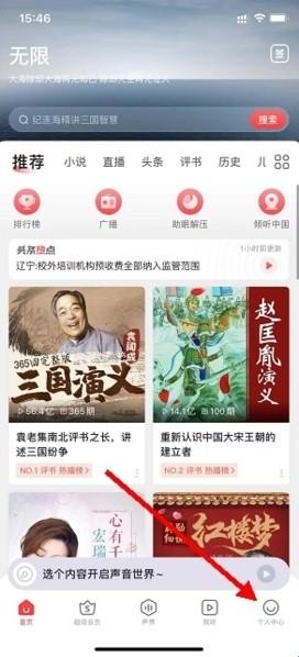 1、进入蜻蜓听书主页,选择底部菜单栏,点击个人中心。
