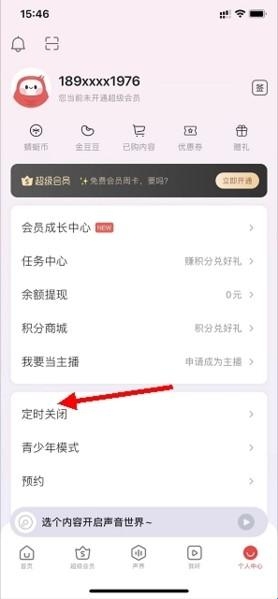2、在个人中心的设置面板中,选择定时关闭设置。