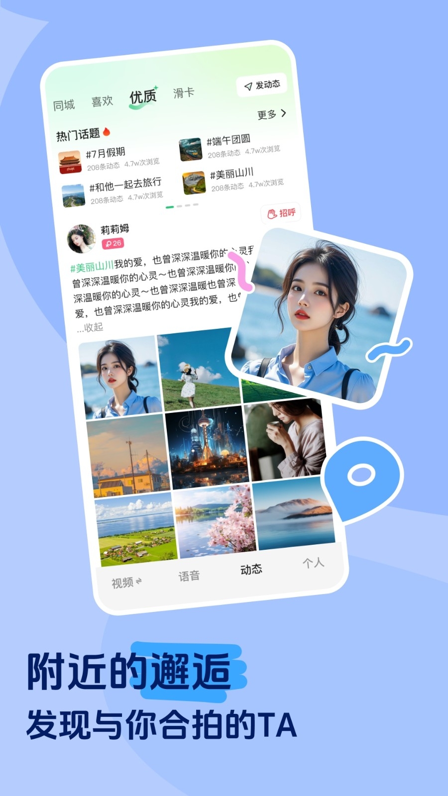 2、精彩动态,同城附近人一目了然,随时来场浪漫约会。