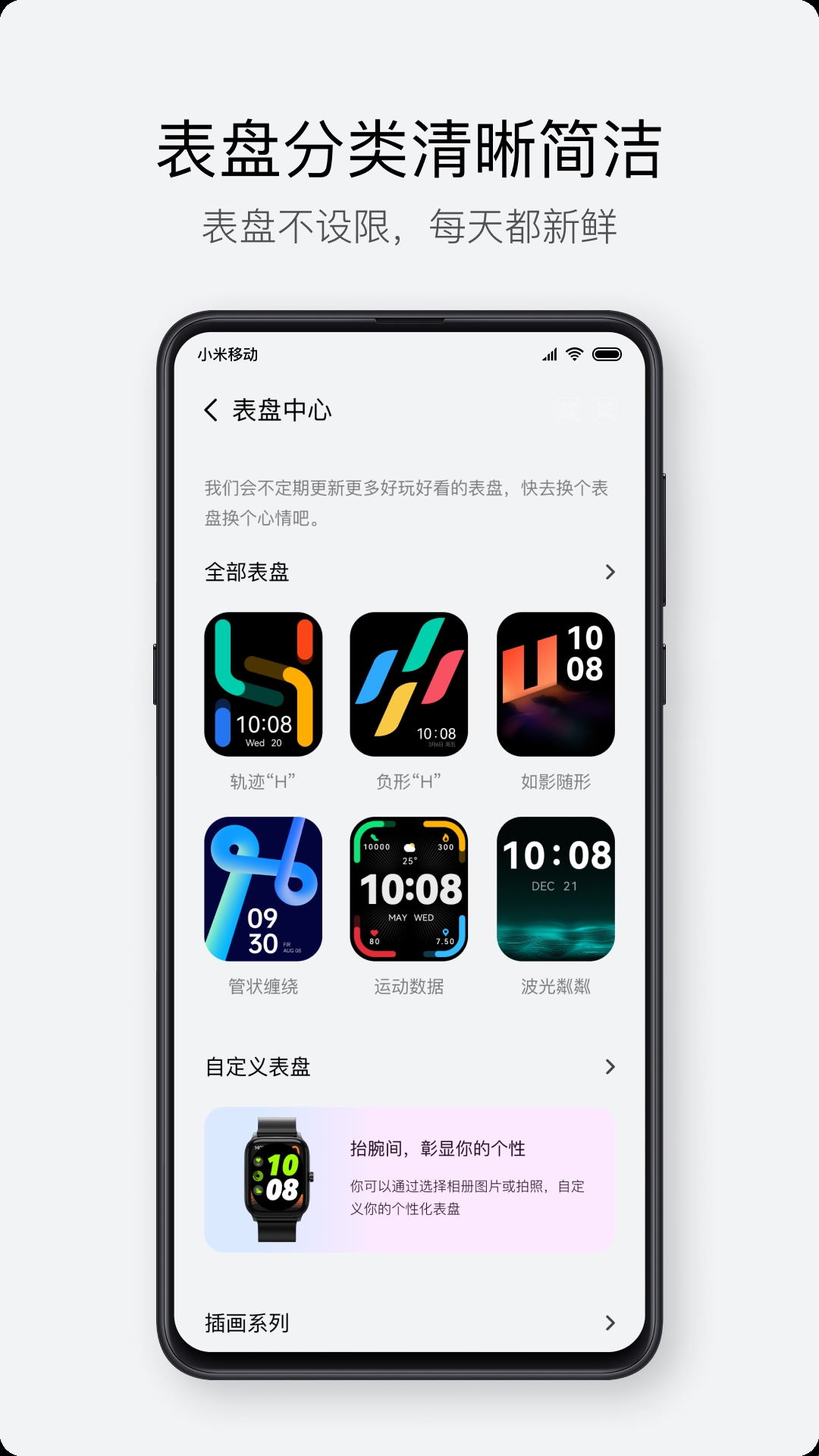 海量的表盘可供选择,跟随自己的心情选择喜欢的表盘同步至手表,并可以将喜欢的图片设置为自己的表盘。