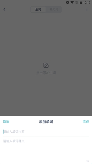 4、进入添加单词界面,输入单词拼写、单词释义,点击【完成】。