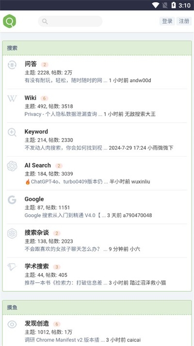 1、我们在软件中不仅可以搜索东西还可以进入软件的社区与大家互动,找到与自己乐趣相投的人来一起聊天。