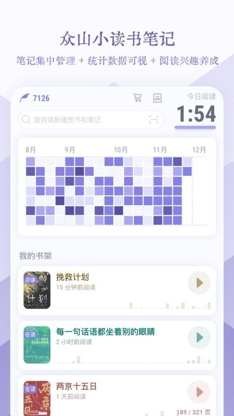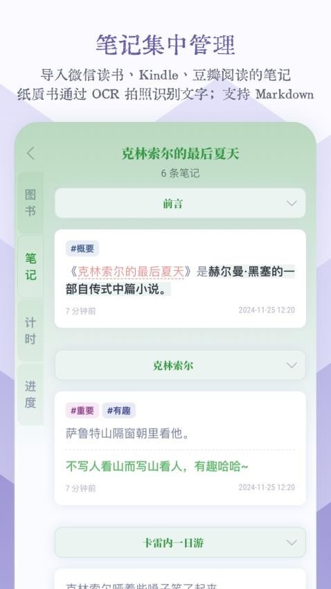 2、集成多种平台的读书笔记,纸质书支持 OCR 文字识别,集中管理搜索笔记。记录阅读时间,了解阅读统计信息,激励自己养成阅读习惯。不管是学生党还是上班族,它将会是所有爱书人的绝佳阅读伴侣。