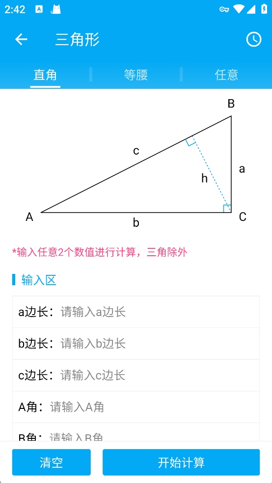 4、以三角形计算为例,输入相应的参数后,点击开始计算,软件就会自动为你计算了。